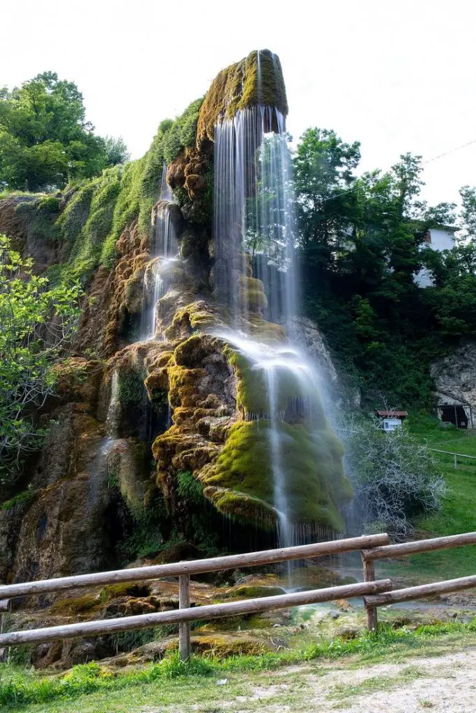 La cascata si getta da una roccia che pare sospesa, un grottino scavato nel travertino dove puoi entrare. Dentro, c’è fresco anche d’estate. E quel velo d’acqua che scende davanti all’ingresso crea un gioco di luce che ha qualcosa di sacro.