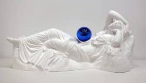 Un dettaglio – quello della sfera blu – che rende l’opera inequivocabilmente contemporanea. Koons la posiziona su calchi in gesso di statue antiche e oggetti di uso quotidiano, creando un corto circuito tra generi stilistici e storie culturali differenti.